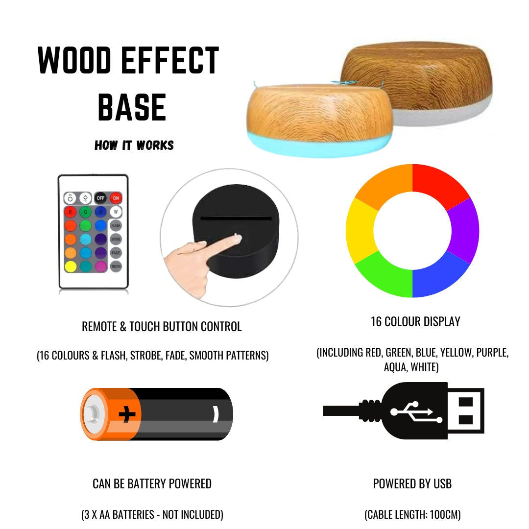A touch button or RGB controller (wood effect base only) is used to select between the different colours and alternating colour patterns.