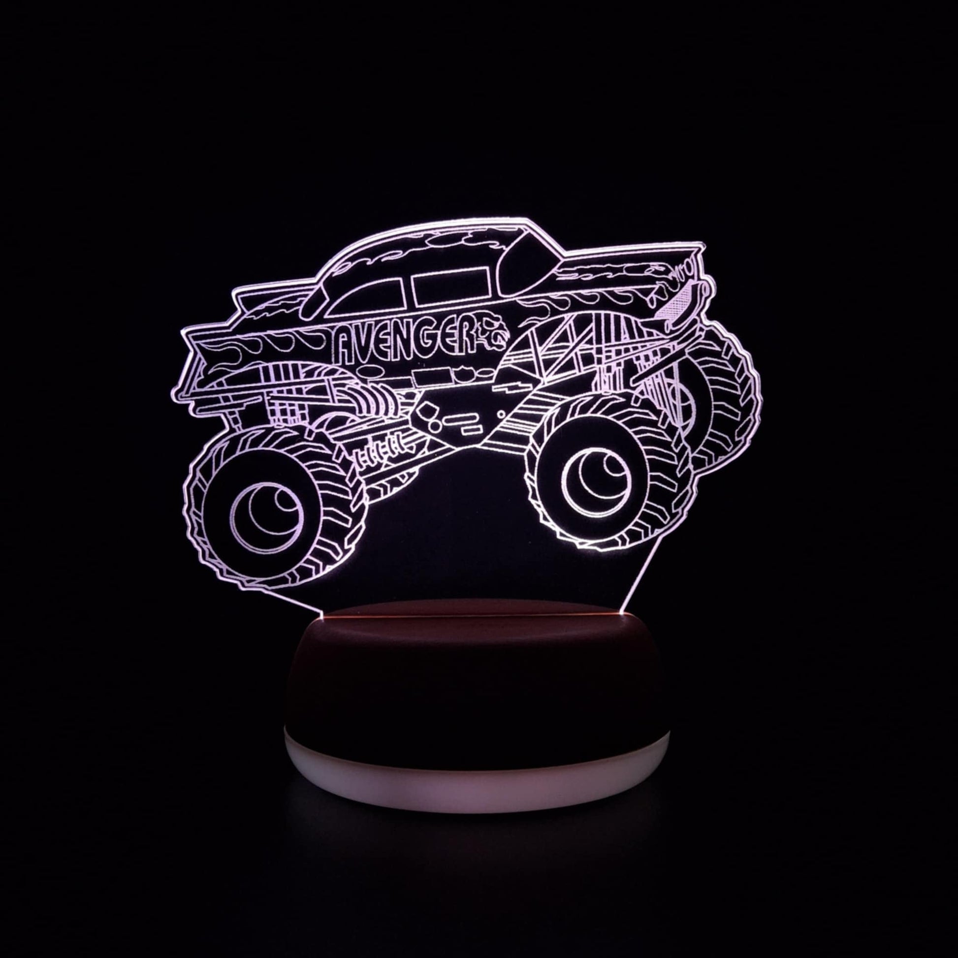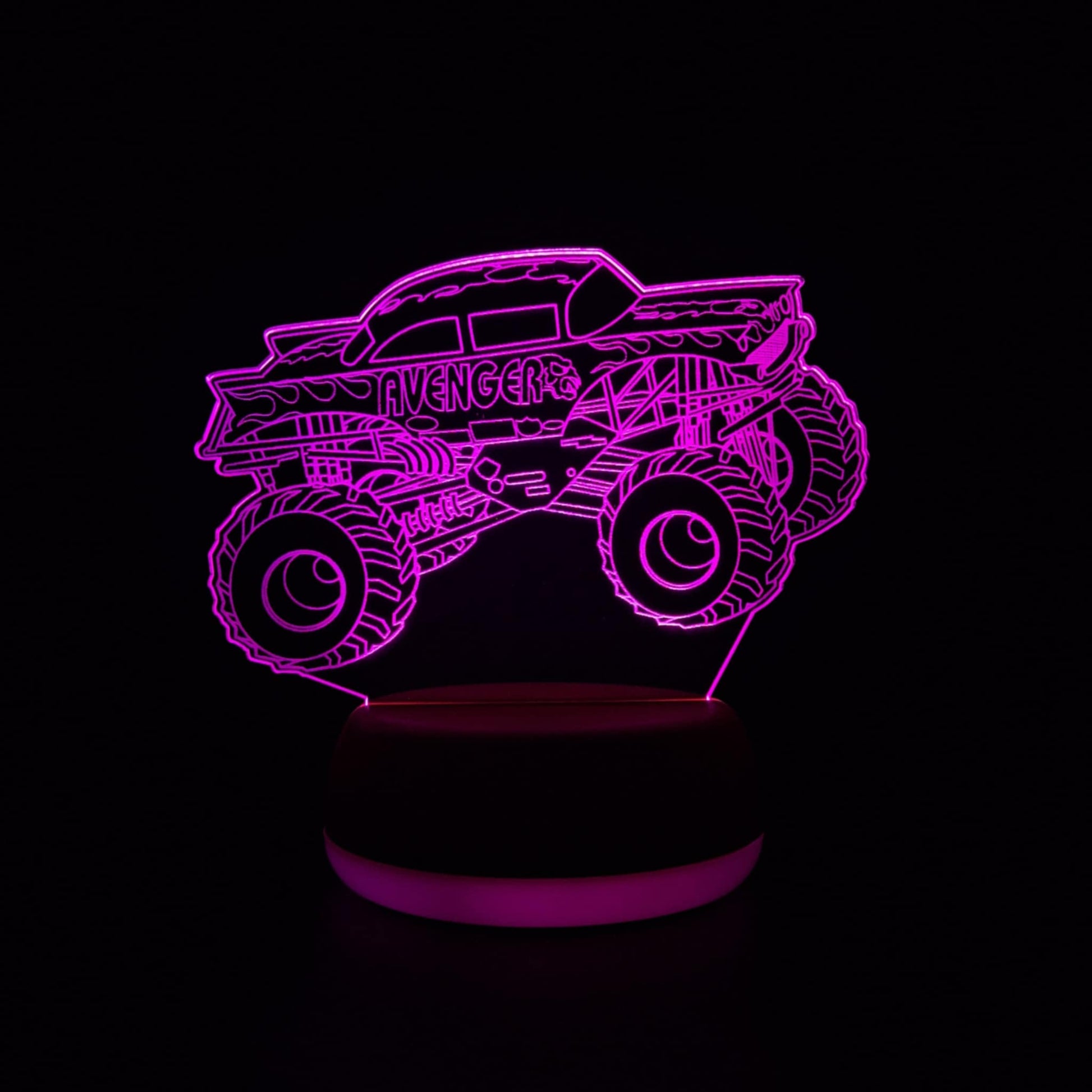 This Avenger monster truck LED night light is the ultimate gift for young truck fans, Monster truck enthusiasts, and lovers of high-octane action. Featuring a bold laser-engraved design of the Avenger truck, this acrylic lamp glows with soft, colourful LED light—perfect for kids' bedrooms, playrooms, or monster truck-themed decor. Mounted on a sleek wooden or colour-changing LED base, it adds excitement and personality to any space. Whether it’s for a birthday, Christmas, or a special surprise, this night light is sure to thrill any child who dreams of roaring engines and big-wheel adventures.