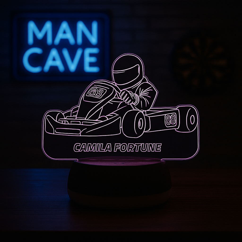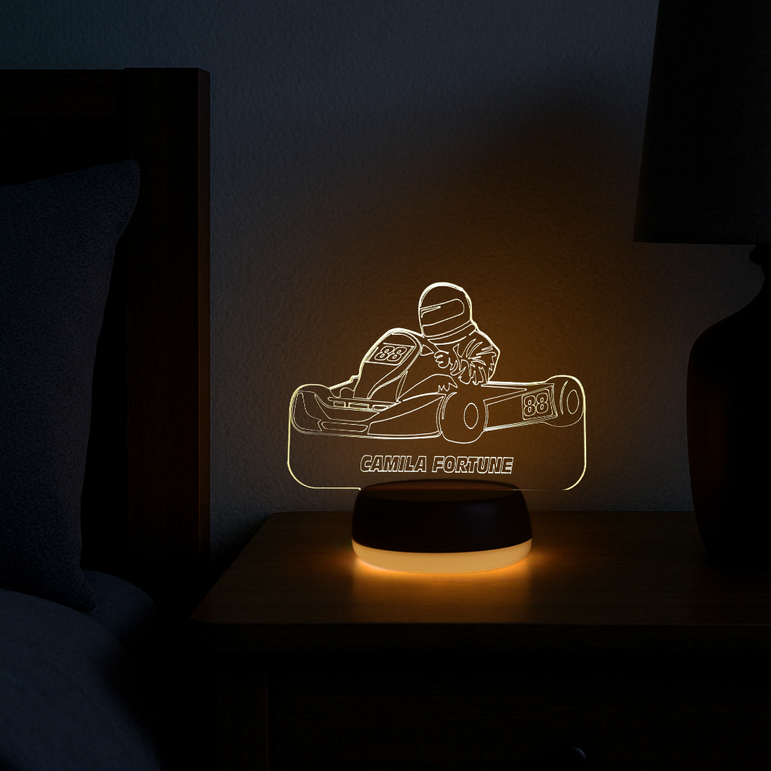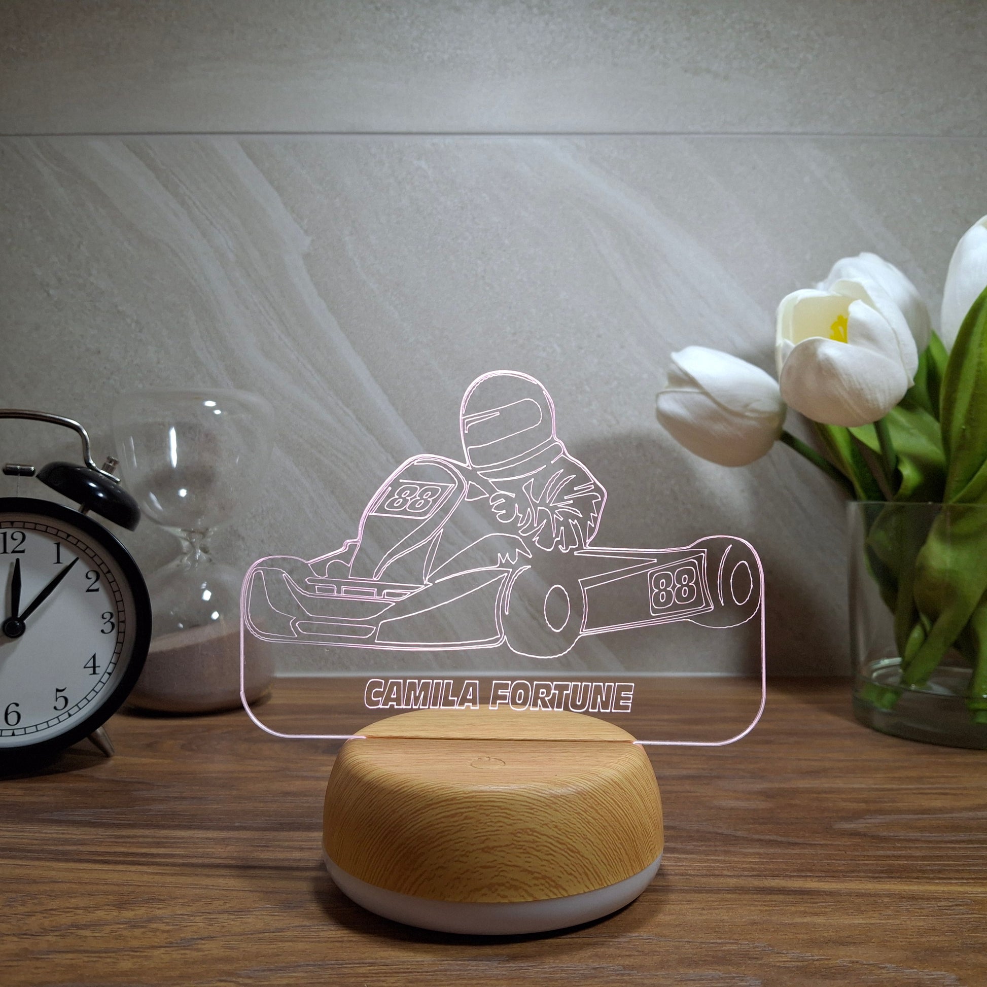 Enhance any bedroom, gaming space or playroom with this striking Personalised Go Kart LED Night Light – a unique gift for go kart enthusiasts, motorsport fans, and children who love racing. Designed with a detailed karting silhouette, this LED light makes an ideal personalised gift for birthdays, Christmas, or special occasions.