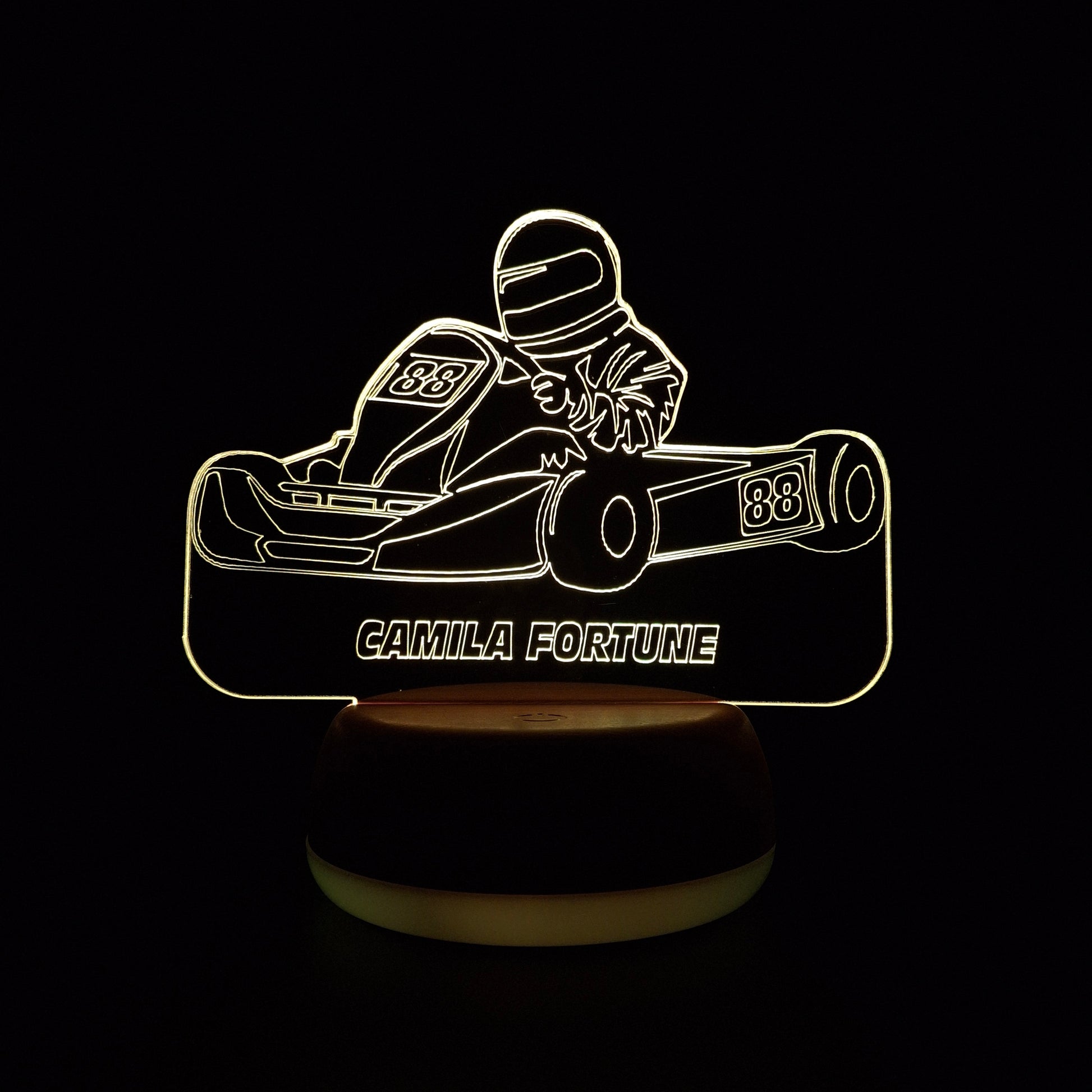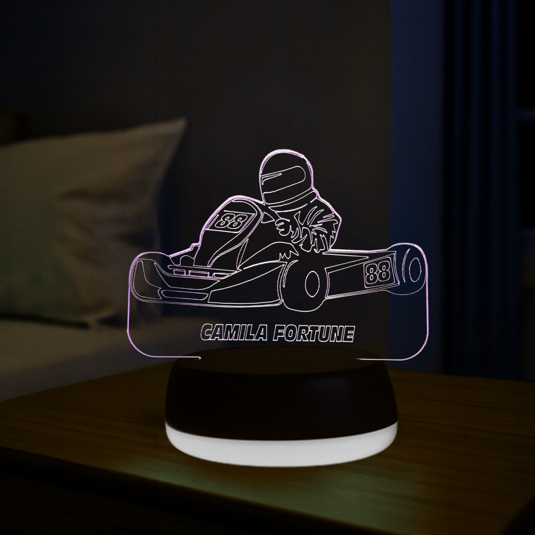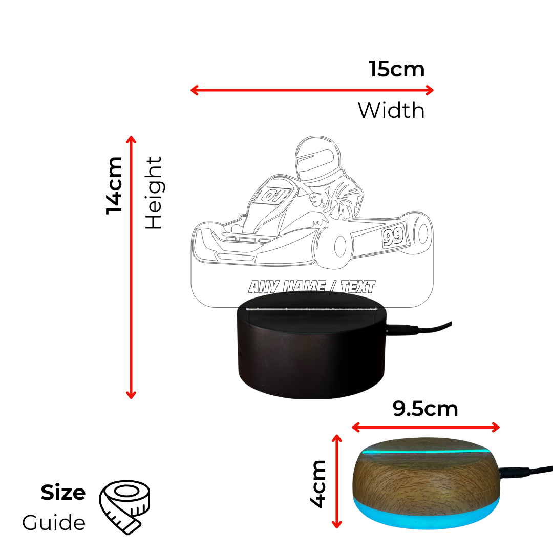 Enhance any bedroom, gaming space or playroom with this striking Personalised Go Kart LED Night Light – a unique gift for go kart enthusiasts, motorsport fans, and children who love racing. Designed with a detailed karting silhouette, this LED light makes an ideal personalised gift for birthdays, Christmas, or special occasions.